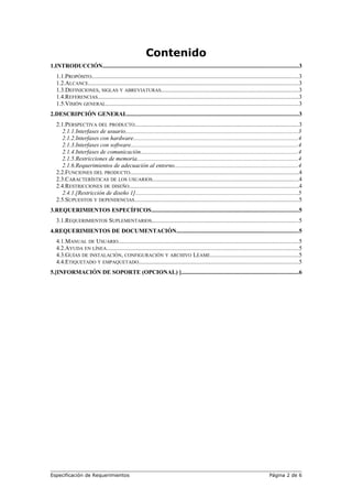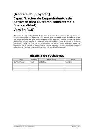 Este documento proporciona una plantilla para la elaboración de una Especificación de Requerimientos de Software. La plantilla incluye secciones para la introducción, descripción general, requerimientos específicos y de documentación. El propósito es guiar el desarrollo de un documento que defina claramente los requerimientos funcionales y no funcionales de un sistema de software.