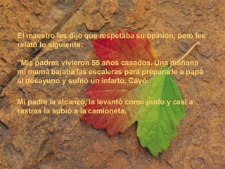 El maestro les contó a los jóvenes la historia de sus padres que estuvieron casados por 55 años. Cuando la madre murió repentinamente, el padre la llevó al hospital y luego la llevó al cementerio donde expresó que fueron 55 buenos años compartidos y que estaba contento de que ella muriera primero para no sufrir su pérdida. El maestro concluyó que este tipo de amor verdadero se basa en el trabajo y cuidado mutuo de dos personas comprometidas, no en el romanticismo.