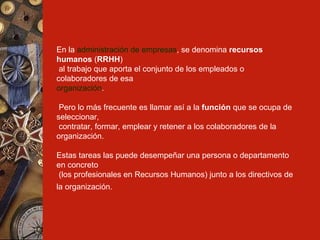 El documento habla sobre la administración de recursos humanos. Explica que esta función se encarga de seleccionar, contratar, capacitar y retener empleados para alinear las políticas de personal con la estrategia de la organización. También cubre temas como la planificación de personal, el reclutamiento y selección de empleados, la política salarial y la compensación de los trabajadores.
