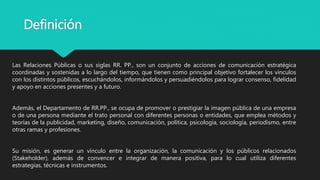 El documento define las relaciones públicas como acciones de comunicación estratégica coordinadas a largo plazo para fortalecer los vínculos con los públicos, escucharlos, informarlos y persuadirlos para ganar su apoyo. El departamento de relaciones públicas se encarga de promover la imagen de una empresa u organización mediante el trato con diferentes grupos. Su misión es generar un vínculo entre la organización y sus públicos de interés utilizando diferentes estrategias y técnicas de comunicación.