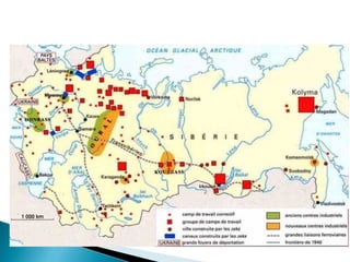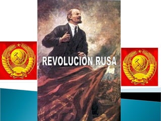 El documento resume los principales hitos de la Revolución Rusa de 1917 y el establecimiento del régimen soviético bajo Lenin y Stalin. Detalla la caída del zarismo en febrero de 1917 y el ascenso de los bolcheviques al poder en octubre del mismo año tras el asalto al Palacio de Invierno. Explica las políticas económicas implementadas por Lenin y Stalin como el comunismo de guerra, la NEP y los planes quinquenales, así como la consolidación del poder de Stalin y el establecimiento de su dictadura
