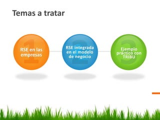 El documento aborda la responsabilidad social empresarial (RSE) como un enfoque que integra objetivos económicos y sociales, sugiriendo que las empresas pueden ser competitivas al alinearse con propósitos positivos. Se presenta la RSE avanzada como una misión y visión que trasciende la mera reducción de costos, destacando ejemplos como Tribu, que ofrece ropa sostenible. Concluye que los modelos de negocio innovadores, que incorporan la RSE, generan un impacto significativo y son fundamentales para un futuro sostenible.