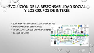 El documento resume la evolución de la responsabilidad social empresarial y su vinculación con los grupos de interés. Explica que la RSE surgió entre 1889-1975 gracias a autores como Carnegie, Clark y Sheldon. En las décadas siguientes, autores como Bowen, Davis y Friedman desarrollaron diferentes visiones del concepto. A partir de los años 70, la RSE se enfocó más en los grupos de interés como accionistas, empleados y la comunidad. Finalmente, en los años 2000 la RSE se vinculó con el desarrollo sostenible