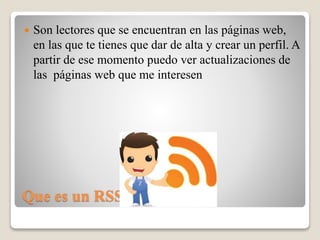 RSS es un servicio que permite a los usuarios suscribirse a actualizaciones de contenido de páginas web y blogs a través de lectores RSS. Estos lectores se descargan gratuitamente e identifican sitios web con contenido actualizado mediante un logotipo naranja. Una vez instalado el lector y seleccionadas las suscripciones deseadas, el usuario recibe automáticamente las nuevas publicaciones de esas páginas web.