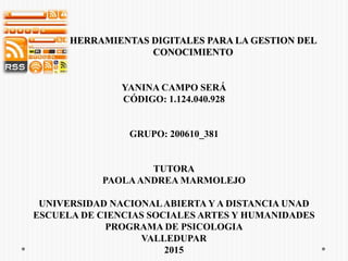 El documento describe las herramientas digitales para la gestión del conocimiento, incluyendo RSS que permite recibir actualizaciones de páginas web favoritas de forma automática, cómo funciona RSS distribuyendo contenido actualizado a usuarios suscritos, y diferentes tipos de lectores RSS como los que se instalan localmente, los online que funcionan a través de una página web, o los integrados en navegadores o correo electrónico.