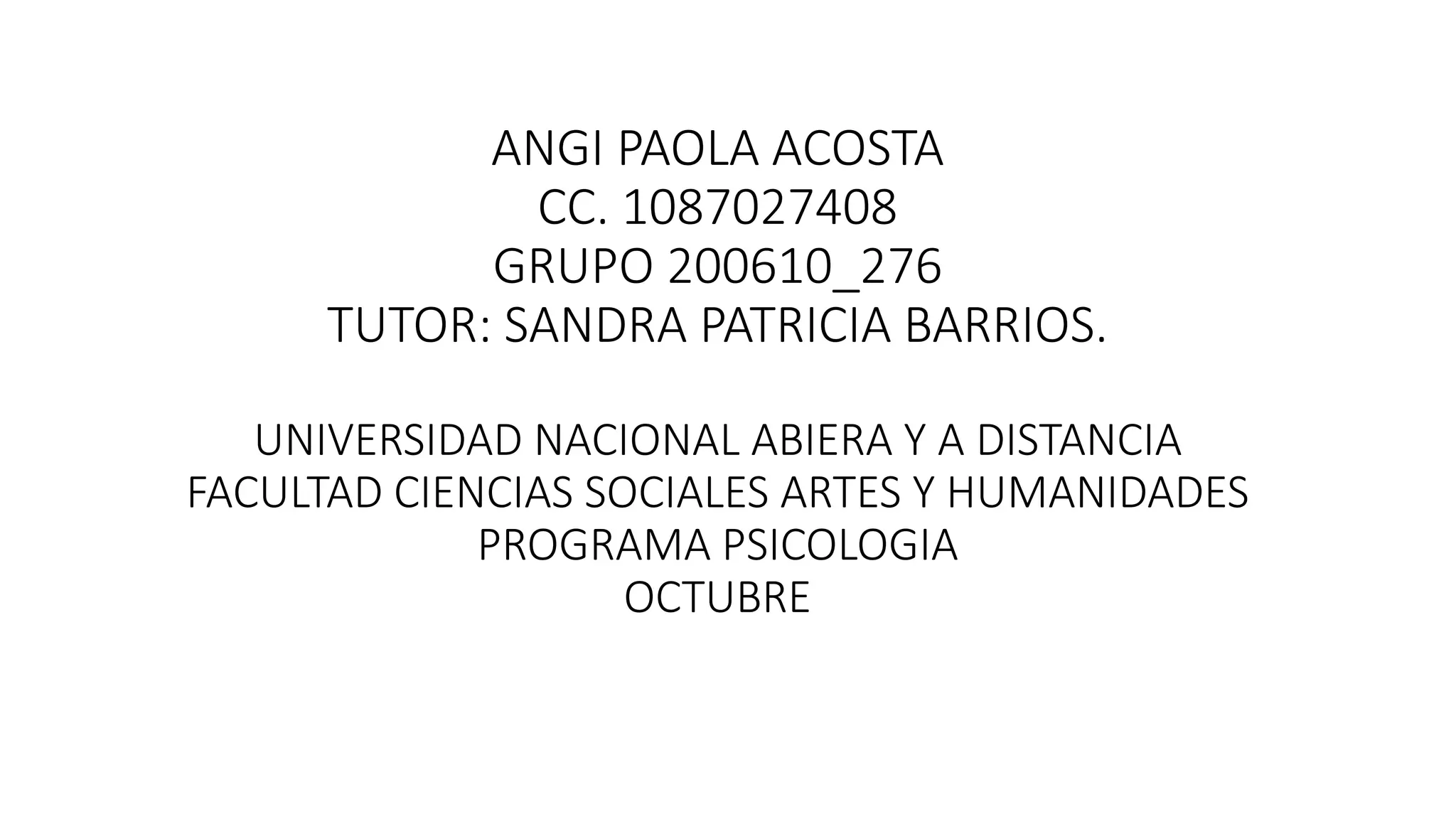 Este documento presenta información sobre Angi Paola Acosta, una estudiante de psicología en la Universidad Nacional Abierta y a Distancia con cédula 1087027408 que pertenece al grupo 200610_276 y está siendo tutelada por Sandra Patricia Barrios.