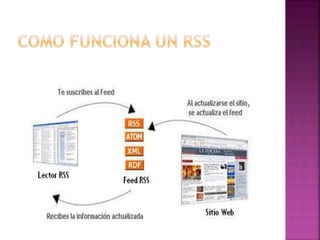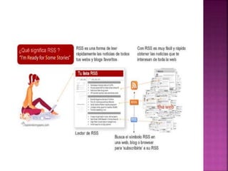 El documento habla sobre los lectores RSS, que son aplicaciones que permiten a los usuarios recibir actualizaciones de los contenidos de los sitios y blogs de su interés en un solo lugar. Menciona algunos lectores RSS populares como FeedDemon, BlogLines y FeedReader, y explica las razones para empezar a usar un lector RSS como evitar perderse publicaciones, configurar la dieta informativa y organizar las fuentes por categorías.