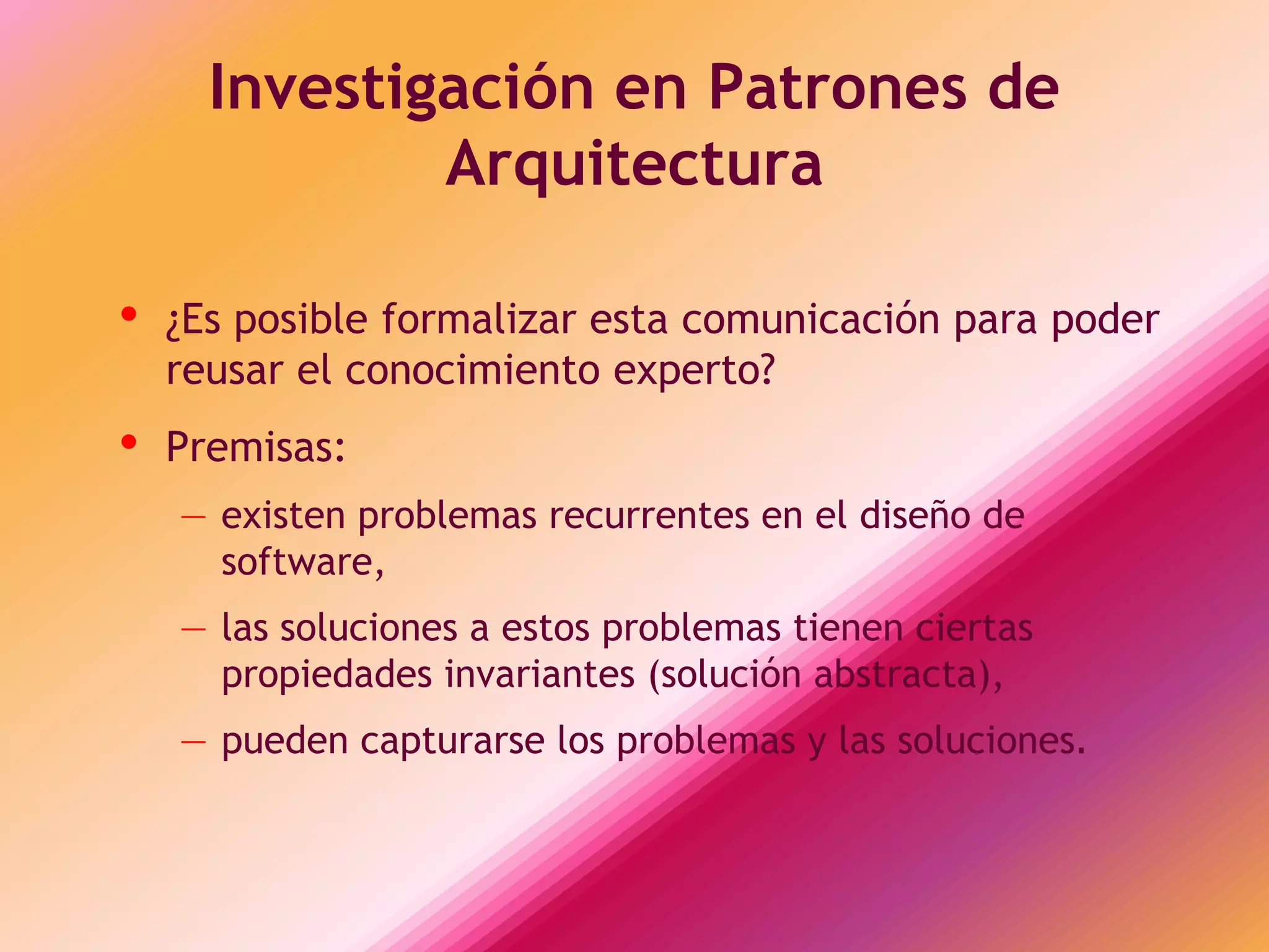 Este documento describe los patrones de arquitectura de software. Explica que los patrones capturan experiencia probada de diseño para resolver problemas comunes de una manera abstracta y reutilizable. Los patrones describen un contexto, problema y solución genérica a través de componentes y relaciones. El objetivo es formalizar el conocimiento de diseño y permitir su reuso.