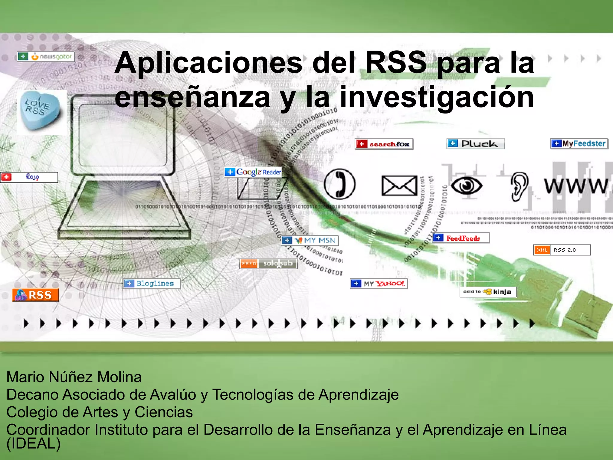 Este documento presenta las aplicaciones del RSS (Really Simple Syndication) para la enseñanza y la investigación. Explica que el RSS permite recibir actualizaciones de contenido web sin necesidad de visitar las páginas, y describe usos populares como recibir noticias, seguimiento de paquetes, ofertas de subastas, y más. También detalla cómo usar agregadores de RSS, y aplicaciones específicas como recibir alertas sobre fondos de investigación, artículos de revistas, actualizaciones de búsquedas en bases de datos, y