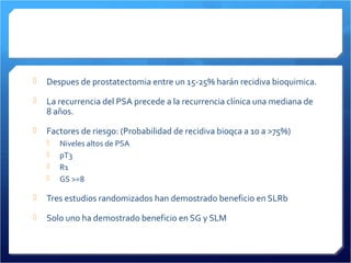 Este documento resume los resultados de tres estudios clínicos aleatorizados sobre la radioterapia adyuvante después de la prostatectomía radical en pacientes con cáncer de próstata de alto riesgo. Los estudios encontraron que la radioterapia adyuvante mejora la supervivencia libre de progresión bioquímica, especialmente en pacientes con márgenes positivos o enfermedad pT3, pero solo uno de los estudios mostró un beneficio en la supervivencia global y la supervivencia libre de metástasis.