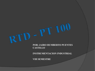 Un RTD-Pt100 es un sensor de temperatura que consiste en un alambre de platino cuya resistencia eléctrica aumenta de forma no lineal a medida que aumenta la temperatura, permitiendo medir la temperatura exacta mediante tablas. Existen tres modos de conexión para una Pt100 - dos hilos, tres hilos y cuatro hilos - con diferentes niveles de precisión. Las Pt100 tienen ventajas sobre las termocuplas para aplicaciones de bajas temperaturas, como una mayor precisión y la capacidad de detectar fallas.