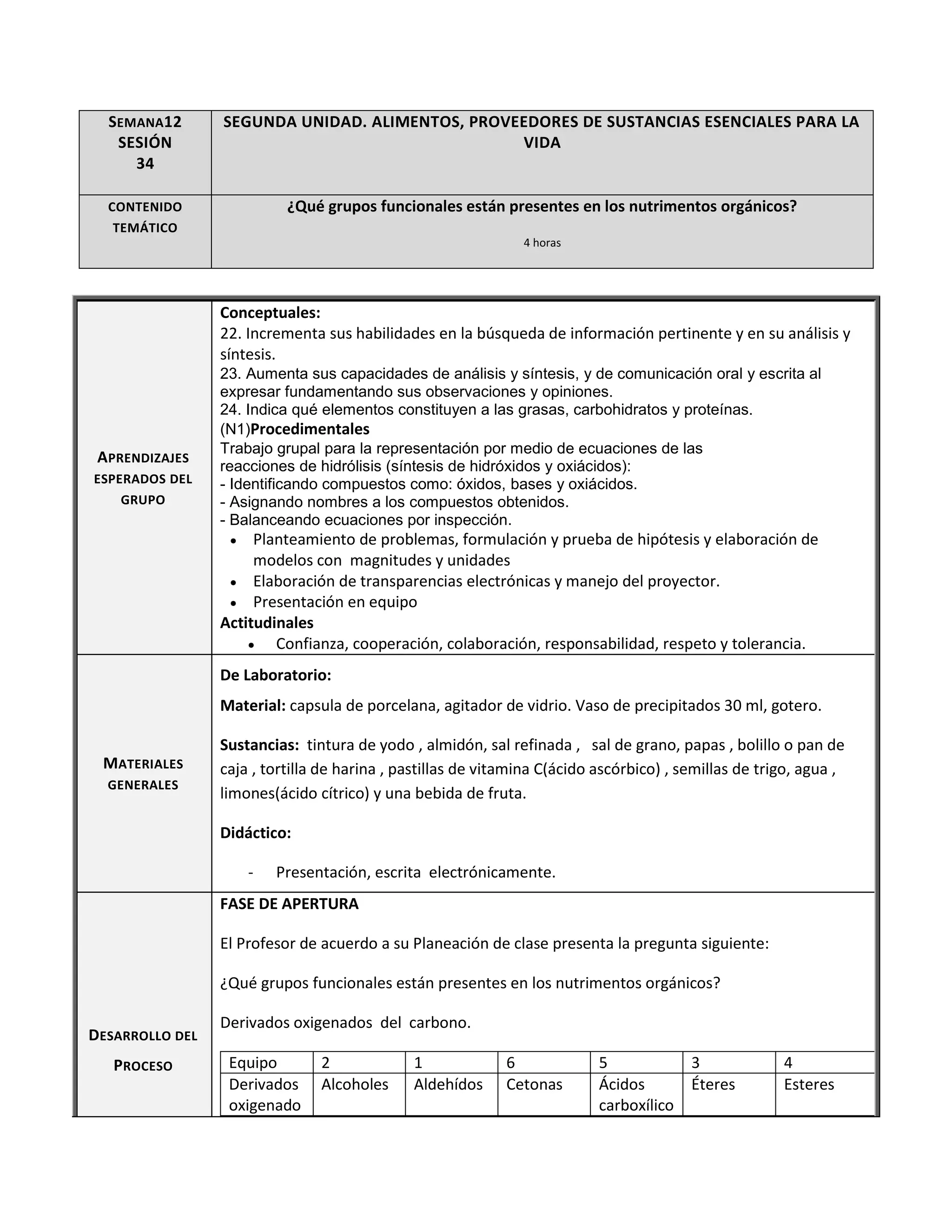 El documento describe una sesión de aprendizaje sobre los grupos funcionales presentes en los nutrimentos orgánicos. Los estudiantes trabajarán en equipos para investigar la fórmula estructural de sustancias como el aspartame, la vitamina C y la triestearina, e identificar sus grupos funcionales y a qué nutrimento pertenecen. Luego realizarán experimentos de laboratorio para detectar carbohidratos, almidón, yodo y vitamina C en diferentes alimentos. Al final, los equipos presentarán sus hallazgos y