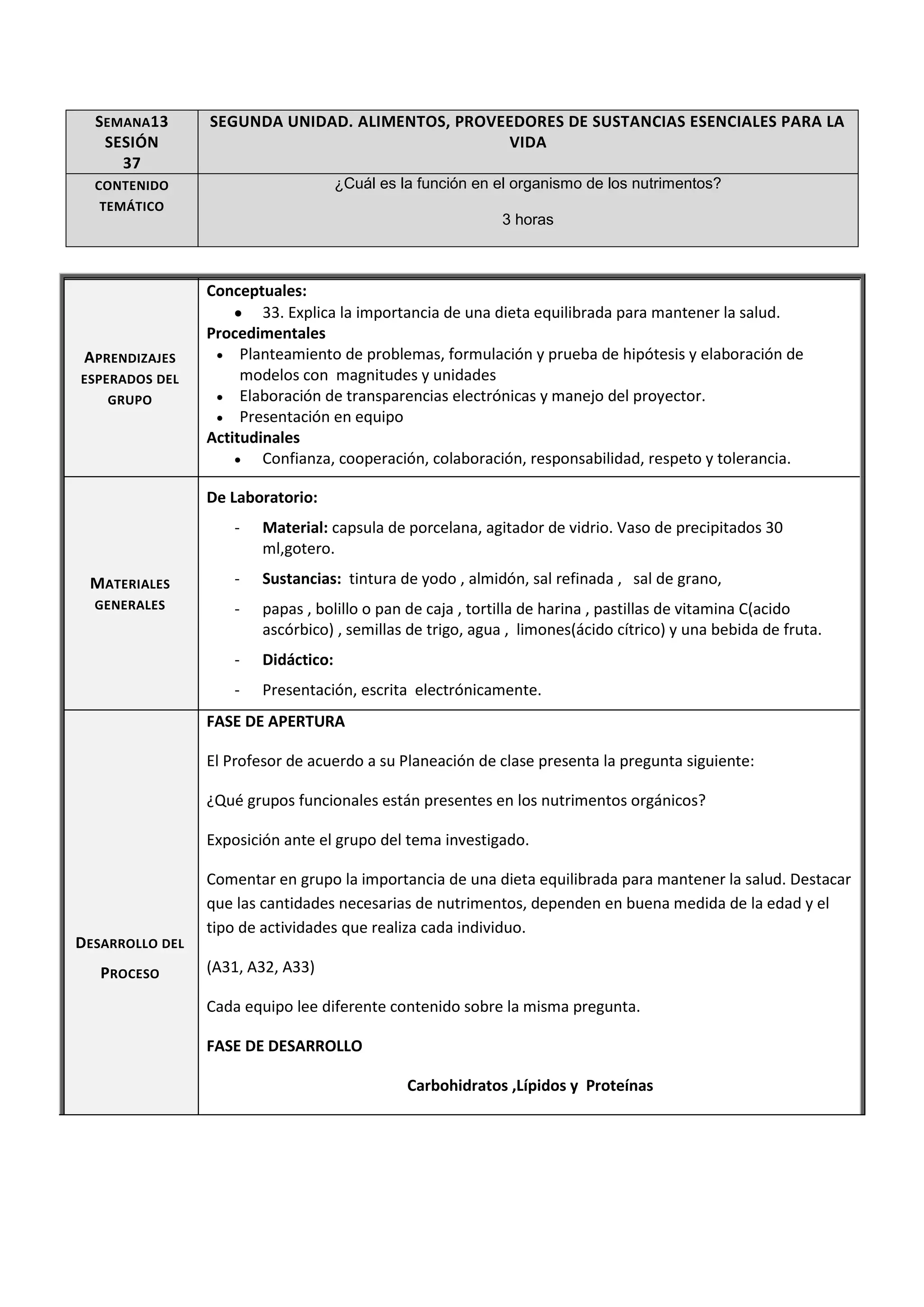 Este documento presenta una sesión sobre alimentos y nutrimentos. Se discuten los carbohidratos, lípidos y proteínas, incluyendo su estructura química y función. Se realizan experimentos para identificar carbohidratos, lípidos y proteínas. Los estudiantes aprenden sobre la saponificación de los lípidos y cómo esta reacción se usa industrialmente para hacer jabón. Al final, los equipos comparten lo que aprendieron y discuten en grupo los temas cubiertos.