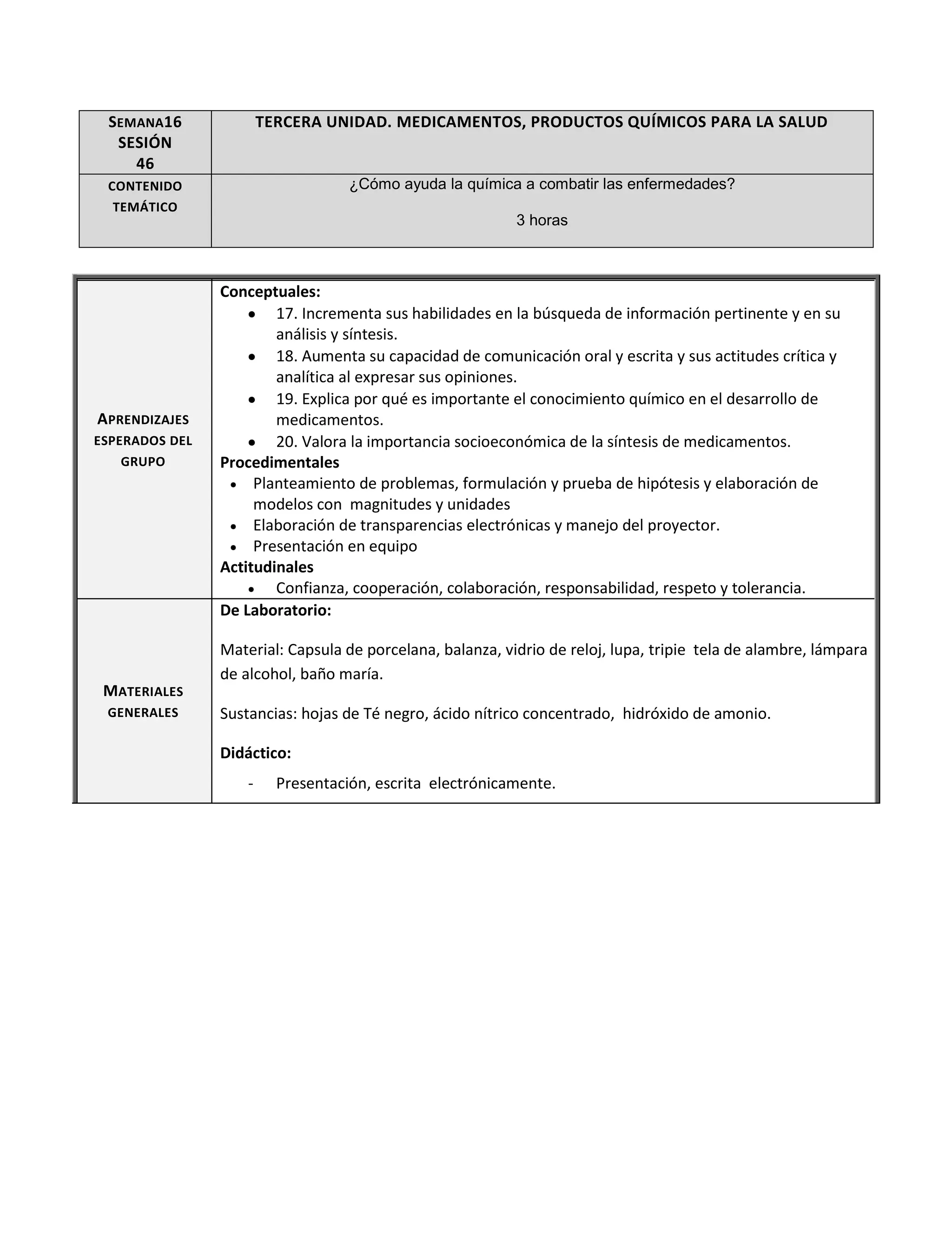 Este documento describe una sesión de 46 sobre medicamentos y productos químicos para la salud. Los estudiantes aprenderán cómo la química ayuda a combatir las enfermedades y desarrollar medicamentos más efectivos. Realizarán una práctica de laboratorio para obtener cafeína por sublimación y analizarán investigaciones sobre medicamentos, discutiendo aspectos socioeconómicos. Presentarán sus hallazgos y concluirán el importante papel de la química en generar tratamientos que mejoran la salud.