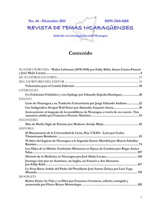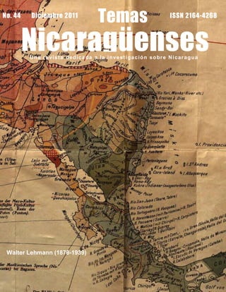 Este documento presenta la portada de la edición No. 44 de diciembre de 2011 de la revista "Revista de Temas Nicaragüenses". La portada destaca un mapa lingüístico de América Central creado por Walter Lehmann, un lingüista alemán que estudió las lenguas indígenas de México y América Central en el siglo XX. El artículo proporciona antecedentes biográficos sobre Lehmann y describe brevemente su importante trabajo investigando y documentando las lenguas indígenas de la región.