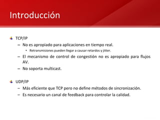 RTP es un protocolo diseñado para la transmisión de medios en tiempo real sobre IP. Permite la transmisión de audio y video mediante la adición de marcas de secuencia y tiempo a los paquetes. RTCP es un protocolo complementario que proporciona información de control y calidad del servicio sobre la sesión RTP, permitiendo a los participantes sincronizar y adaptar los flujos transmitidos.
