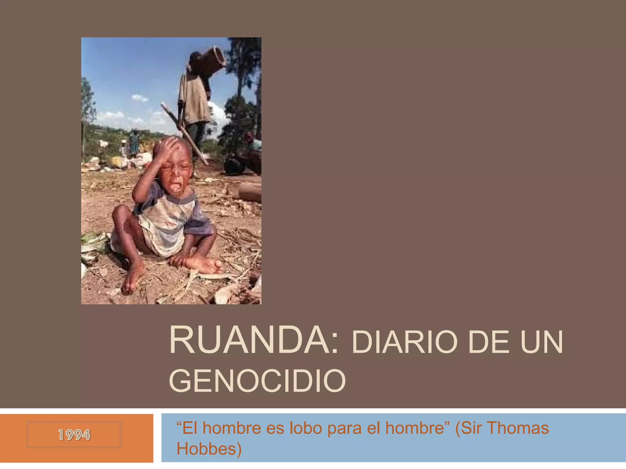 El documento describe el genocidio ocurrido en Ruanda en 1994 donde cientos de miles de personas de la etnia tutsi fueron asesinadas. Las causas incluyeron una crisis económica y alimentaria que aumentó las tensiones entre las etnias hutu y tutsi, así como la retirada de las fuerzas de paz de la ONU que permitió que comenzaran las masacres sistemáticas. A pesar de las advertencias de organizaciones como la Cruz Roja sobre la magnitud de la matanza, la comunidad internacional se mantuvo inactiva y el genoc