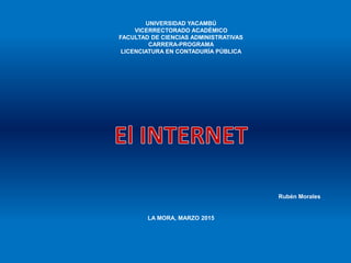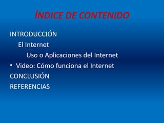 El documento describe el Internet, sus usos y aplicaciones principales. Explica que el Internet es una red de redes que conecta computadoras alrededor del mundo permitiendo el intercambio de información. Sus principales usos son como herramienta de información a través de motores de búsqueda, como medio de comunicación a través de redes sociales y correo electrónico, para negocios permitiendo la venta de productos en línea, y para ocio a través de música, videos y juegos en línea. Algunas aplicaciones clave son la n
