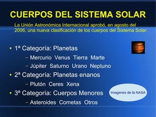 La Unión Astronómica Internacional clasifica los cuerpos del Sistema Solar en 3 categorías: planetas, planetas enanos y cuerpos menores. Los 8 planetas principales son Mercurio, Venus, Tierra, Marte, Júpiter, Saturno, Urano y Neptuno. Los 3 planetas enanos son Plutón, Eris y Ceres. El documento también proporciona detalles sobre las características y datos de cada planeta.