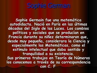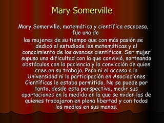Este documento presenta breves biografías de importantes matemáticas e investigadoras a lo largo de la historia, incluyendo sus contribuciones a las matemáticas y la ciencia. Algunas de las mujeres destacadas son Sofía Kovalevskaya, la primera mujer profesora de matemáticas en Europa; Émilie du Châtelet, traductora pionera de los trabajos de Newton; e Hipatia de Alejandría, una de las primeras filósofas y científicas conocidas.
