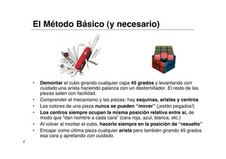 Este documento proporciona instrucciones detalladas para resolver el Cubo de Rubik en cinco pasos. Explica las convenciones y notación estándar, y describe cómo completar cada capa y girar las esquinas de forma óptima utilizando algoritmos cortos. También incluye ejemplos ilustrados y referencias adicionales para aquellos interesados en mejorar su velocidad de resolución.