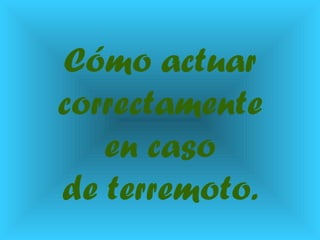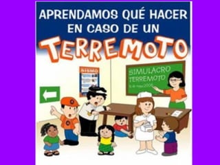 El documento ofrece instrucciones sobre cómo actuar durante y después de un terremoto, recomendando agacharse, cubrirse y agarrarse debajo de una mesa o escritorio fuerte, alejarse de ventanas, muebles altos y fachadas, y cortar los servicios una vez haya pasado para prevenir incendios o maremotos.