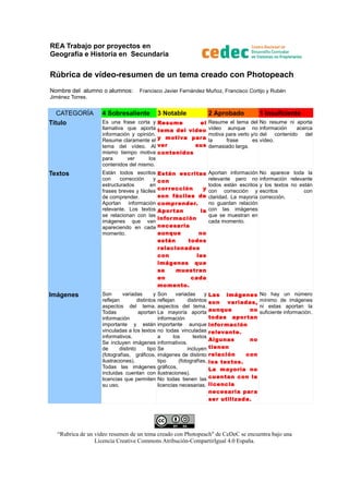 Este documento presenta una rúbrica para evaluar vídeo-resúmenes de temas creados con Photopeach. La rúbrica evalúa categorías como el título, los textos, las imágenes, la música y los créditos finales del vídeo según criterios de corrección, relevancia de la información, variedad de elementos y licencias de uso.