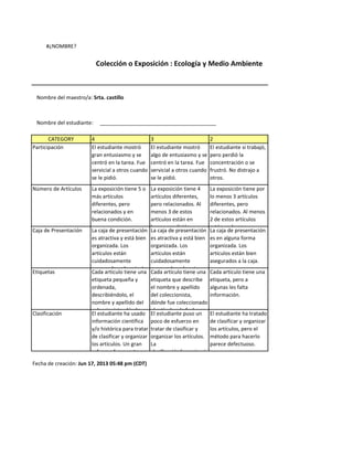 Este documento presenta una rúbrica para evaluar una exposición de colección de estudiantes en las categorías de participación, número de artículos, caja de presentación, etiquetas y clasificación. Se provee una descripción detallada de los niveles de desempeño en cada categoría, incluyendo los requisitos para lograr una calificación alta.