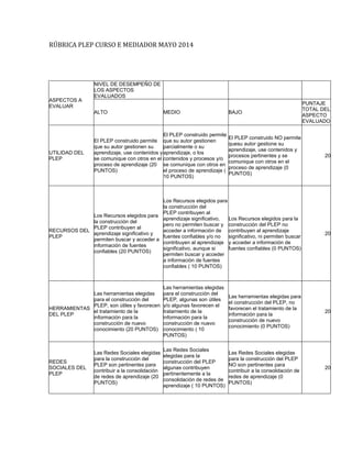 Este documento presenta una rúbrica para evaluar un PLEP (Personal Learning Environment Portfolio) en 5 aspectos: utilidad, recursos, herramientas, redes sociales y difusión. Cada aspecto tiene 3 niveles de desempeño (alto, medio y bajo) y una puntuación asociada. El objetivo es evaluar en qué medida el PLEP permite la gestión del aprendizaje, el uso de contenidos relevantes y la comunicación con otros, así como la calidad de los recursos, herramientas, redes y promoción util