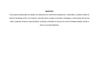 Este documento presenta una rúbrica de evaluación para estudiantes de la Universidad Virtual del Estado de Michoacán en México. La rúbrica evalúa tres aspectos claves: la escritura, el lenguaje y los conocimientos de los estudiantes en sus trabajos escritos, participación en foros y uso de la tecnología. Proporciona criterios de evaluación en cuatro niveles para cada indicador.