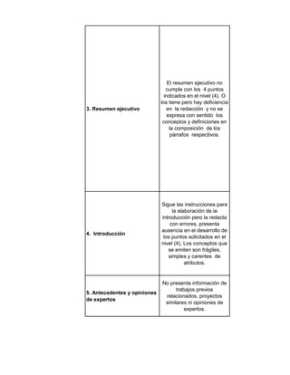 Este documento presenta los criterios de evaluación para clasificar un proyecto en cuatro niveles de desempeño (incipiente, aceptable, satisfactorio y óptimo) según la calidad de su documentación escrita. Describe los requisitos mínimos para el resumen ejecutivo, introducción, análisis del contexto, objetivos, metodología, alternativas y entregables. El nivel óptimo cumple con todos los criterios, mientras que los niveles inferiores cumplen solo algunos de manera parcial o presentan