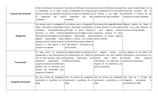 Este documento presenta una escala de calificación de 1 a 4 para evaluar blogs en varias categorías, incluyendo contenido, derechos de autor, interés, conocimientos del material, precisión del contenido, navegación, presentación y ortografía/gramática. Describe los criterios para cada nivel de calificación en cada categoría.