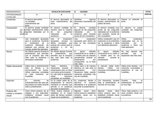 Este documento presenta una escala de evaluación para medir la calidad de una presentación en varios criterios como contenido, comprensión, vocabulario, apoyo visual, claridad al hablar, volumen y postura. Los criterios se evalúan en una escala del 1 al 5, donde 5 es la más alta calidad y 1 es la más baja. La escala provee descripciones para cada nivel de desempeño en cada criterio.