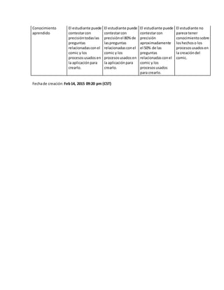 El documento evalúa un cómic titulado '¡Cuidemos el agua es responsabilidad de todos!' realizado por un estudiante bajo la supervisión de la maestra Carmen Andrea Fajardo. Se analizan diversos aspectos como la inclusión de elementos solicitados, el diseño y la originalidad de los dibujos, así como el conocimiento del estudiante sobre el contenido. La evaluación se basa en criterios específicos, destacando la importancia de la creatividad y la comprensión del tema tratado.