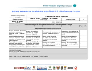 El documento presenta una matriz de valoración del portafolio interactivo digital (PID) y un planificador de proyecto en el contexto del programa de formación en educación digital. Se evalúa la estructura, integración de evidencias y claridad en la presentación de actividades del portafolio, atribuyendo puntajes según varios criterios. Se incluyen recomendaciones específicas para mejorar el proyecto y menciones de pares académicos que participan en la evaluación.