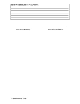 Este documento presenta una plantilla de evaluación para un texto descriptivo escrito por un estudiante llamado Dr. Alex Hernández Torres de la Universidad Nacional de Cajamarca. La plantilla incluye indicadores para evaluar el contenido del texto en áreas como la organización, descripción, datos, áreas de la empresa y uso del lenguaje, así como indicadores para evaluar la actitud del estudiante en el trabajo como participación, responsabilidad y trabajo en equipo. El evaluador debe marcar el nivel de logro del estudiante para cada indicador y calcular las notas finales