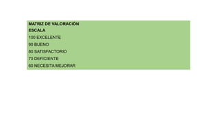 Este documento presenta diferentes matrices y rúbricas de evaluación para diversos tipos de trabajos escolares como resúmenes, mapas mentales, fichas de lectura, trípticos, maquetas y proyectos finales. Incluye criterios e indicadores de evaluación en cada rúbrica con una escala de puntuación.