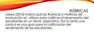 Este documento explica qué son las rúbricas y cómo se pueden utilizar. Las rúbricas son herramientas de evaluación que proporcionan criterios claros para calificar el desempeño de los estudiantes en un tema específico. Ofrecen ventajas tanto para profesores como estudiantes y deben incluir descriptores para cada nivel de rendimiento. El documento también describe los pasos para crear una rúbrica efectiva.