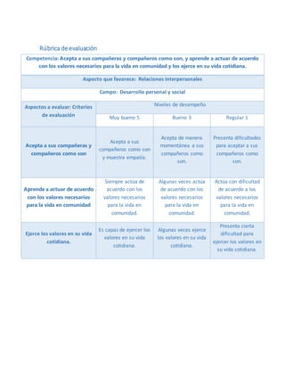 El documento presenta una rúbrica de evaluación para medir la competencia de aceptar a los compañeros y actuar de acuerdo con los valores de la comunidad. La rúbrica evalúa tres aspectos: aceptar a los compañeros, actuar con valores de comunidad, y ejercer valores en la vida diaria. Los estudiantes son evaluados en cada aspecto en una escala de 1 a 5.