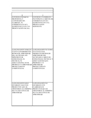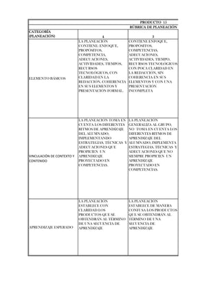 El documento presenta una rúbrica de planeación para evaluar planes de estudio. La rúbrica contiene tres categorías: planeación, vinculación de contexto y contenido, y aprendizaje esperado. Evalúa los planes desde 4 (más completo) hasta 1 (menos completo) dependiendo de qué tan bien incluyen elementos como enfoque, propósitos, competencias, actividades, tiempos, recursos, y claridad en la redacción y presentación.