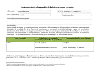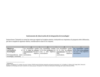 El documento presenta un instrumento de observación para evaluar la integración de tecnología en el aula. El instrumento guía al observador a registrar el tema curricular, las estrategias de enseñanza y actividades de aprendizaje, y las tecnologías usadas por el docente y estudiantes. Luego, el observador completa una rúbrica evaluando cómo se alinean el currículo, estrategias de enseñanza y tecnología, y el uso efectivo de la tecnología en la clase.