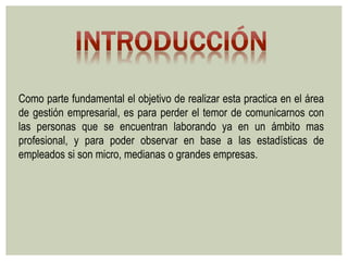 El documento describe una práctica en gestión empresarial centrada en la comunicación y la observación de estadísticas laborales en el sector hotelero, destacando los objetivos de cada hotel para ofrecer un buen servicio de hospedaje. Se mencionan varias empresas, sus direcciones, número de empleados y metas específicas de atención al huésped. La conclusión destaca la importancia de una comunicación respetuosa y amable en el trato con los encargados de los hoteles.