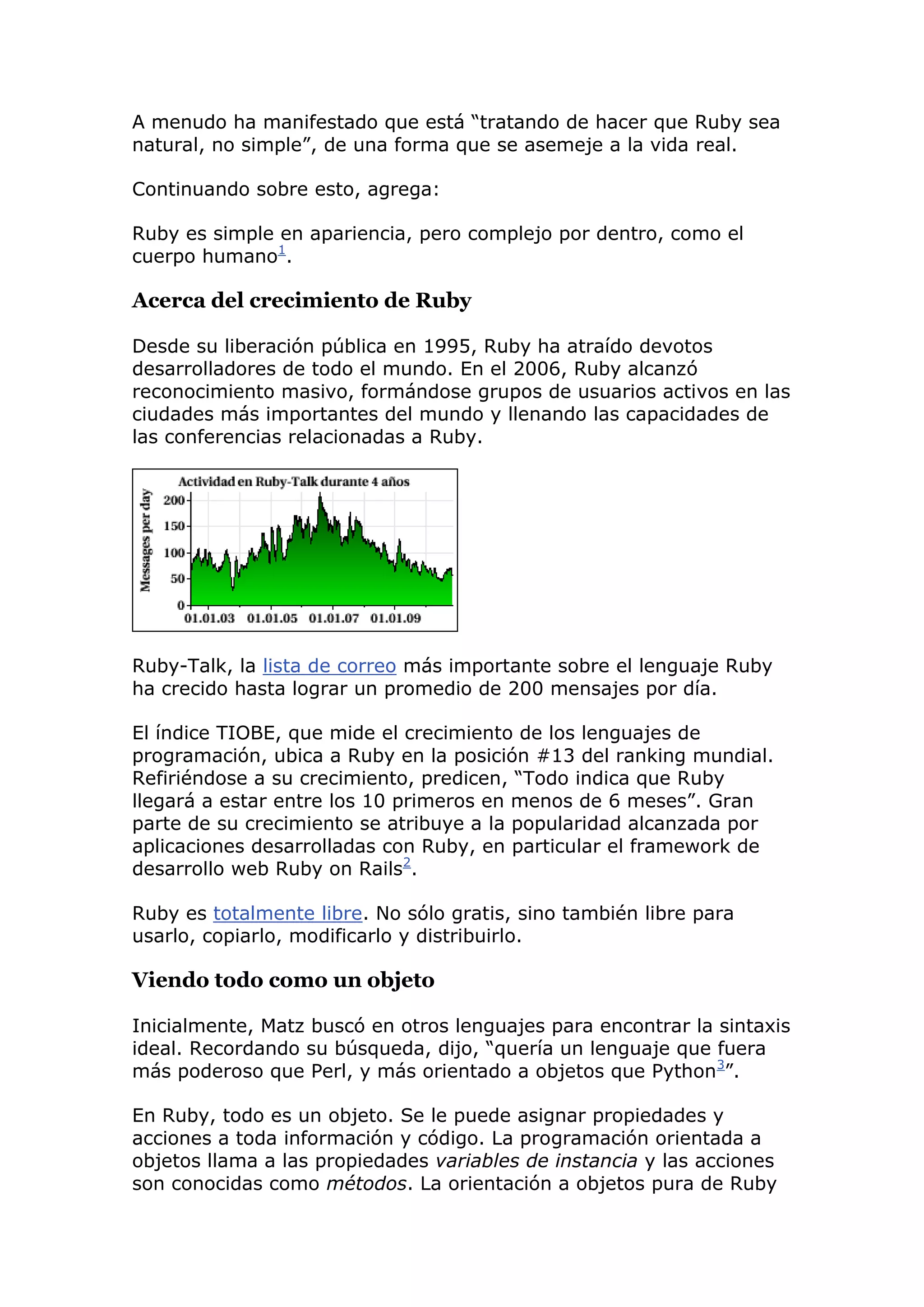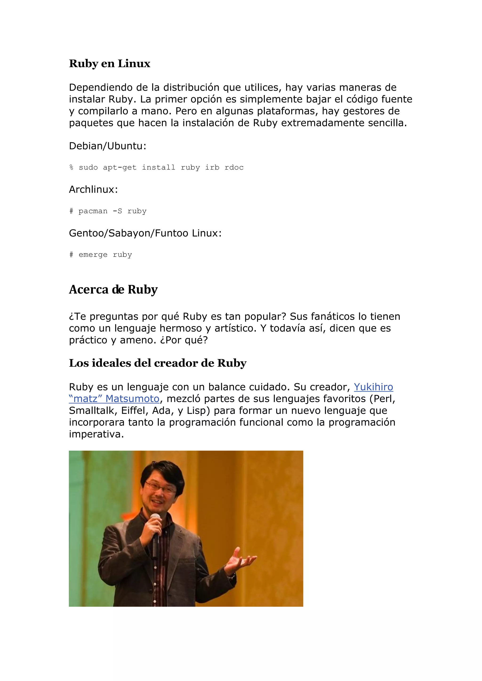 Ruby puede instalarse de varias formas dependiendo de la distribución de Linux utilizada, como compilando el código fuente o usando gestores de paquetes. Ruby es un lenguaje popular debido a que su creador buscó un balance entre la programación funcional y la orientada a objetos tomando lo mejor de otros lenguajes. Ruby sigue creciendo en popularidad impulsado en parte por frameworks como Ruby on Rails.