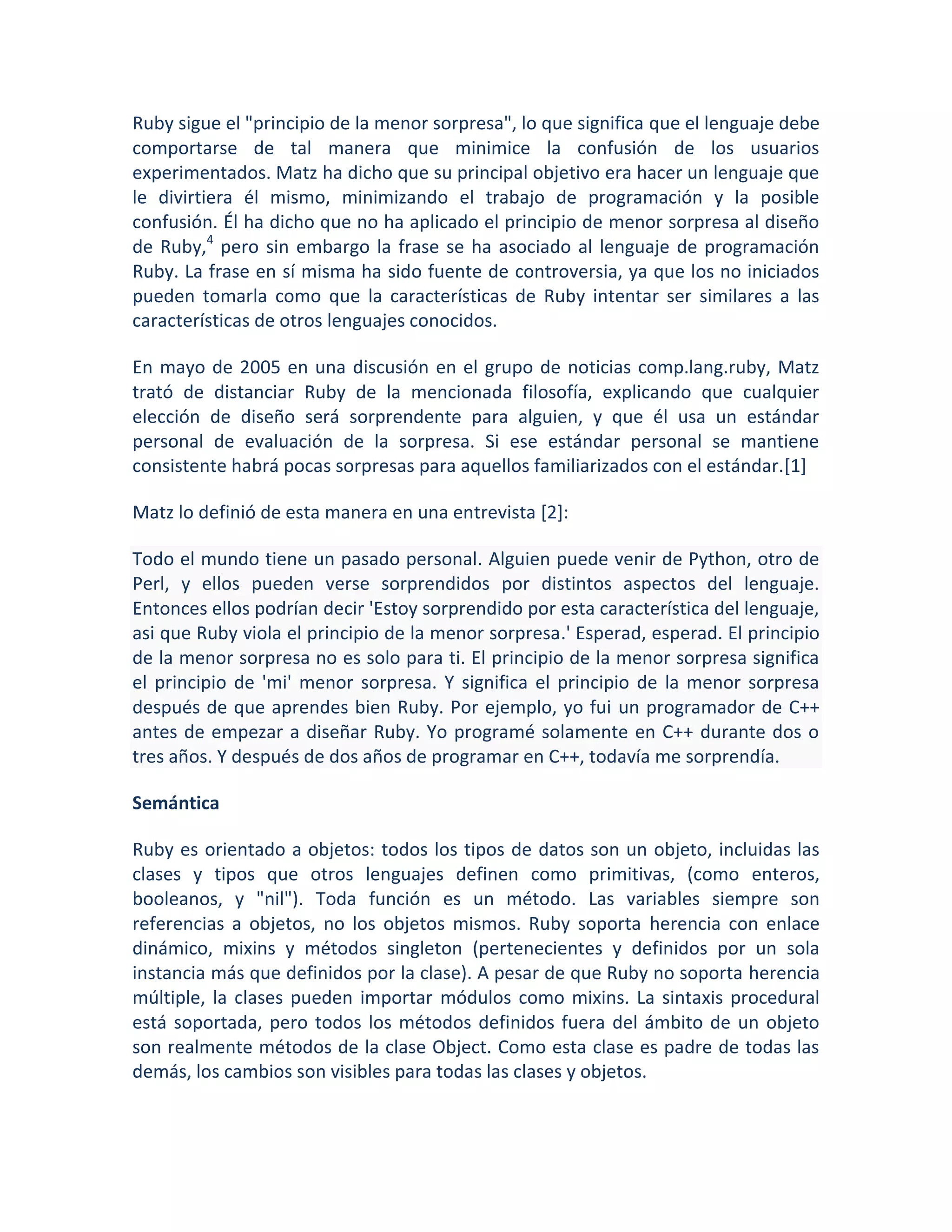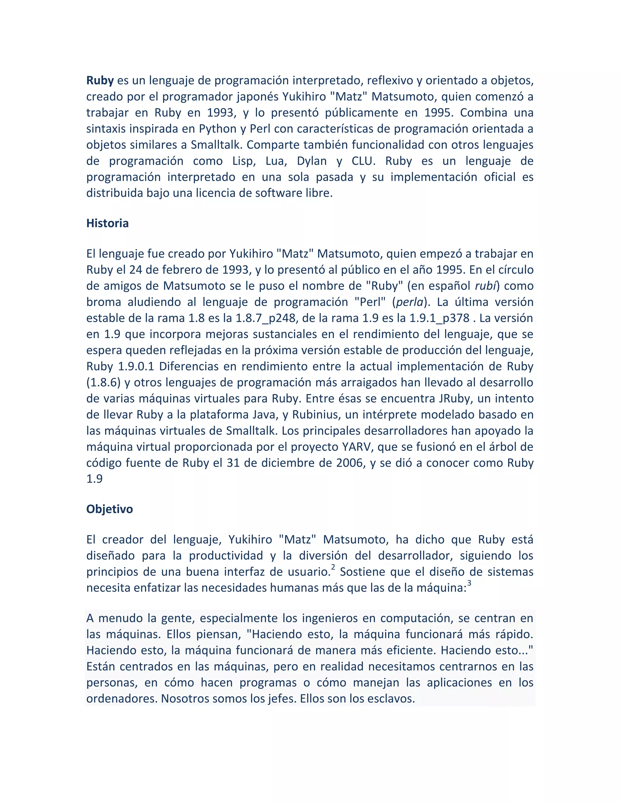 Ruby es un lenguaje de programación interpretado, orientado a objetos y multiparadigma creado por Yukihiro Matsumoto en 1993. Combina características de lenguajes como Python, Perl, Smalltalk y Lisp. Todo en Ruby es un objeto y soporta programación procedural, orientada a objetos y funcional. Su creador diseñó Ruby para ser divertido de usar y minimizar la sorpresa de los desarrolladores.