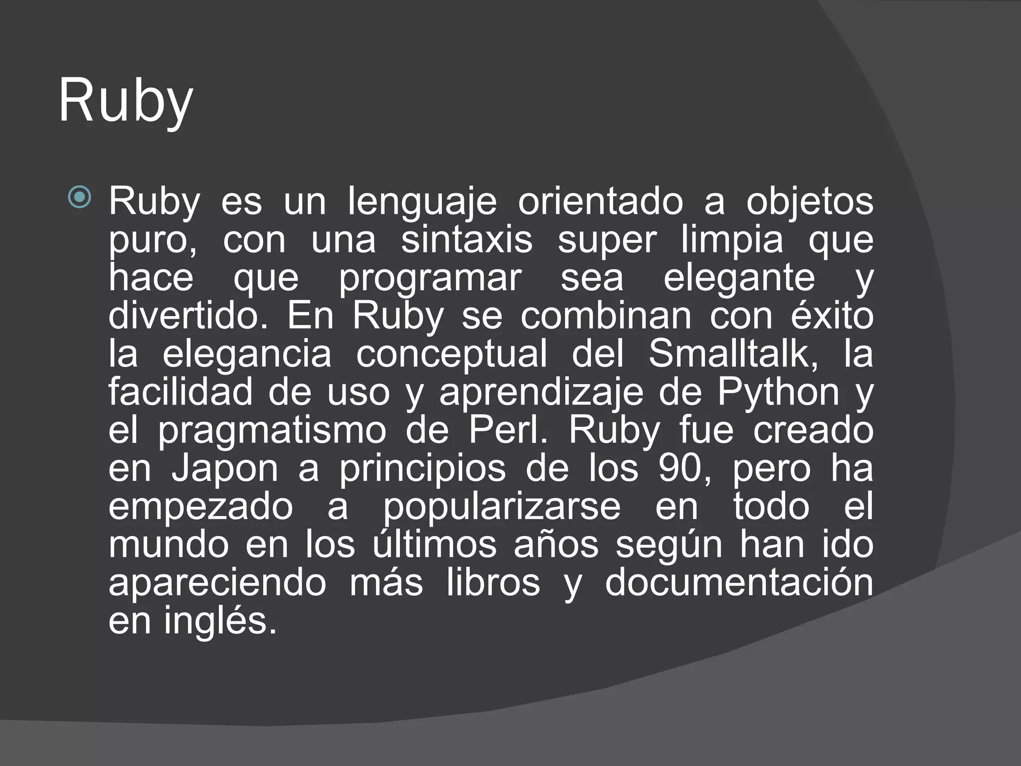 Ruby es un lenguaje de programación orientado a objetos con una sintaxis limpia y elegante creado en Japón en los 90s. Rails es un framework de código abierto para Ruby que permite desarrollar aplicaciones web accediendo a bases de datos de forma sencilla con poco código. Ruby on Rails (RoR), también conocido como Rails, es un popular framework MVC para Ruby que combina simplicidad y posibilidad de crear aplicaciones reales con menos código.