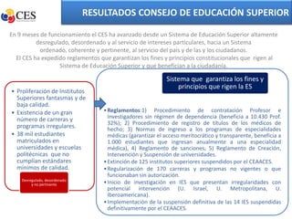 En 9 meses, el CES ha ordenado el Sistema de Educación Superior, regularizando 170 carreras y programas e implementando reglamentos que garantizan los principios constitucionales. Se han cerrado 125 institutos fantasmas y suspendido 14 instituciones definitivamente por irregularidades. Además, se ha iniciado la investigación de 3 universidades por posible intervención. El CES continúa trabajando para culminar carreras, reconocer créditos y desvincular trabajadores con dependencia de forma ordenada.