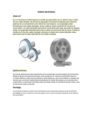 La rueda helicoidal es un mecanismo formado por un tornillo que gira dentro de un cilindro hueco sobre una rueda dentada, transmitiendo el movimiento entre ejes perpendiculares. Se usa principalmente para transmitir movimiento de un eje motor a otro eje situado a distancia, con una rueda conectada al motor (rueda motriz) y otra al eje conducido. La principal ventaja de los engranajes helicoidales sobre las poleas es que no patinan, logrando mayor precisión en la transmisión.