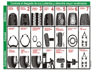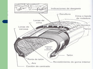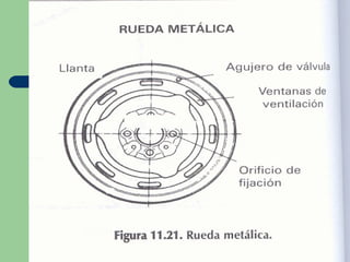 Este documento describe los componentes y características de las ruedas y neumáticos de un vehículo. Explica las partes de la rueda como la llanta y el neumático, incluyendo la banda de rodadura, talones, hombros y flancos. También cubre los tipos de neumáticos como radiales y diagonales, así como cómo identificarlos y controlar su desgaste.