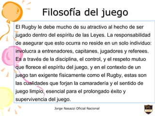 El documento presenta una introducción al rugby, describiendo su filosofía basada en el respeto mutuo y el juego limpio. Explica que las reglas del rugby permiten que personas de diferentes habilidades y edades puedan participar de forma competitiva y divertida. Además, detalla diferentes niveles de enseñanza del rugby centrados en el desarrollo afectivo de los jugadores, su percepción del juego y la organización táctica del equipo.