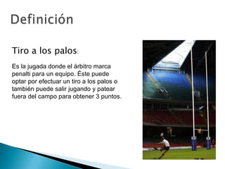 El documento describe el tiro a palos en el fútbol, una jugada donde el árbitro marca un penalti y el equipo puede optar por rematar a puerta directamente o salir jugando para ganar 3 puntos. Explica que se coloca un objeto rojo debajo del balón para que quede recto y se pueda patear bien durante el tiro a palos. Incluye también dos enlaces de YouTube relacionados con esta jugada.
